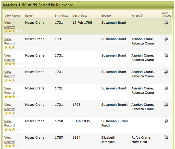 Of course, I clicked on all the links to each of the eight hits for Moses Crane. As an example of the genealogical data found, I’ve used only two pages – those being for item number 6 in the list of hits. However, every one of the applications adds additional family information to my ancestral collection.