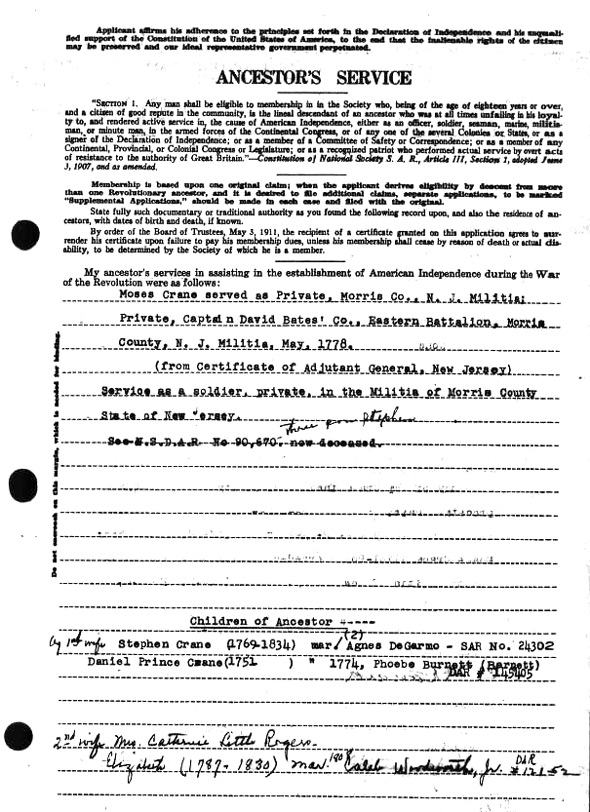 Ancestry.com got the original data from the National Society of the Sons of the American Revolution in Louisville, Kentucky. The data was on 508 rolls of microfilm, allowing Ancestry to convert the data to digital images. The indexing of the many pages in itself is of great value to genealogists. On a personal basis, I’m very excited about the indexing and easy access that we now have available to the applications. I searched for my ancestor, Moses Crane of New Jersey, and got 8 hits on the name. Seven of them were for my guy. Of those seven, five different applicants were represented, because two applicants were applying for the service of father and son ancestors.