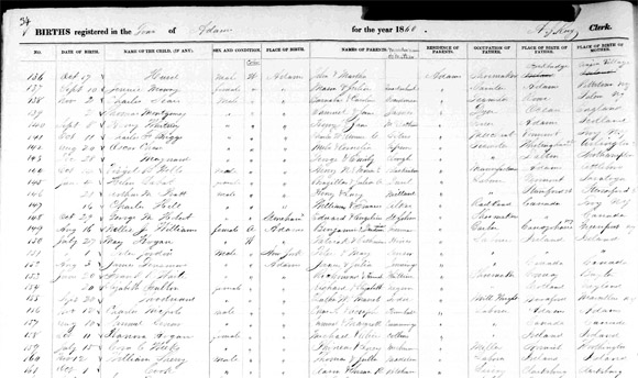 The birth registers are organized by annual volumes. Each is arranged by town and then by entry number for the order in which the birth was entered into the registry. Details include: date of birth, name of child, sex and condition (often color or race), place of birth, parents’ names, birthplace of parents, and occupation of the father.