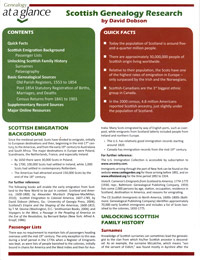 Scots have a long history of emigration. In the mid-17th century most migrated to European destinations such as Poland, Scandinavia, the Netherlands, France, and Ireland. Later America became a popular destination. By the early 19th century Australia and South Africa also became key destinations. There are now approximately six time the number of people claiming Scottish descent living around the world as there are Scots actually living in Scotland today. Genealogy at a Glance: Scottish Genealogy Research can help those 30 million find their Scottish roots. This guide reveals information about important resource to Scottish records.