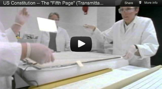 An Inside the Vaults video short, “US Constitution – ‘The Fifth Page’ (Transmittal Page),” discusses the conservation treatment and re-encasement of the document. Chief of the Preservation Laboratory MaryLynn Ritzenthaler and Supervisory Conservator Kitty Nicholson recount their role in the project. The 3:35 minute video is part of the ongoing “Inside the Vaults”series and can be viewed on the National Archives YouTube channel: http://tiny.cc/FifthPage.