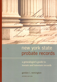 New York Probate Records—A Genealogist’s Guide to Testate and Intestate Records, Second Edition, is a directory-styled handbook by Gordon L. Remington. Broken down by county, this guide shows where and how to locate New York State probate records. These records cover over 350 years of probate history in the region.