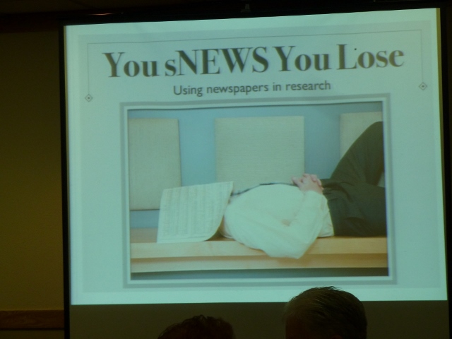 Bret Petersen came up from the Salt Lake area to teach us more about Using Newspapers In Our Research, Finding Those Maiden Names and The Shady Side of the Family Tree: Prison, Criminal, Asylum Records & More. (I recommend him as a speaker/presenter to you and your society: bpetersen@BranchesOfOurTree.com ) This was his opening slide for his newspaper session………. doesn’t it just grab you right in?