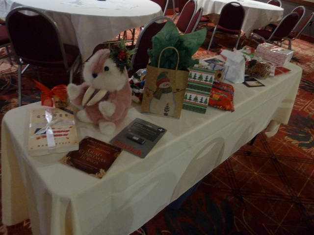 One reason why the Christmas Tour is such a success is that we have fun. Lots and lots of fun interspersed with genealogical researching. One fun thing is that we all wear name tags to identify us as attendees of the Christmas tour and each tag has a number. Every morning numbers are drawn (Bingo circles from a bag) and the lucky winners come front to claim their prizes. The prizes from from the tour members; each attendee is asked to bring an inexpensive genealogy-related gift for this morning gift exchange. (Most bring six for we do this for six days.)