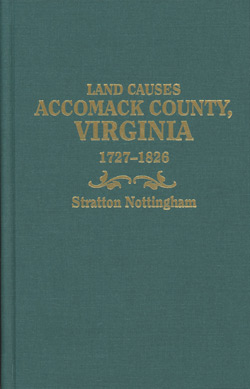 The records included in this volume are invaluable to anyone interested in Eastern Shore genealogy, and, the compiler believe, will prove to be a valuable addition to Virginia genealogy in general. The Land Causes or chancery suits for dower, division of lands, ejectment proceedings & c., give in full the declaration of the plaintiff, the answer of the defendants, the verdict of the jury, depositions, in many instances giving the date of birth, death and marriage of the parties; land is traced form the original patent to about 1825, showing the various owners and their descendants and next of kin through many generations. The records include those of the District Court as well as those of the County Court. In suits for division or ejectment when any of the interested parties have left the county or State, their then place of residence is given.