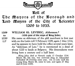 The Roll of Mayors of the Borough and Lord Mayors of the City of Leicester records the names of men holding that office from between the 10th year of the reign of King John in 1209 and all through history to 1935.