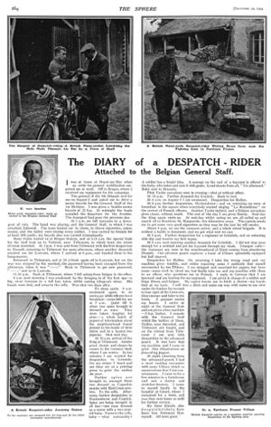 With the recent release of copies of The Sphere, on TheGenealogist, I was thus fascinated to come across the December 12, 1914 edition of the publication. Here was an article about motorcycle despatch riders from the early part of the war. This day’s publication featured a double page evocative image of a motor-cycle despatch rider on his machine fleeing with the enemy on his tail. As I knew that my step-grandfather was in his late twenties at the time and a keen motorcycle rider I could imagine him reading pieces such as this and wanting to join up to the R.E. Motor Cyclists to ‘do his bit’.