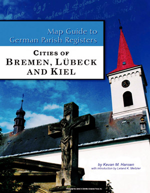 In the last few days, we shipped the all copies of the Map Guide To German Parish Registers Vol. 57 – Cities of Bremen, Lübeck and Kiel, by Kevan Hansen. This volume is made up of three large German cities. They are: Free and Hanseatic City of Bremen, the Free and Hanseatic City of Lübeck and the City of Kiel, Schleswig-Holstein, Prussia. Included are 128 historic stadtteile, or city sections, found in Bremen and Lübeck (see list below). Written in English by Kevan Hansen, this volume was principally written to help family historians resolve where their family may have gone to church – and left vital records behind that may be seen today. This is the fifty-seventh of a series covering all of Germany. These places are as of about 1870 to 1900. The Cities of Bremen, Lübeck and Kiel Map Guide is different than the others, in that totally different techniques are needed to locate in which church your ancestors may have worshipped when doing big city research.