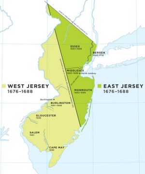 1674-1676. East Jersey and West Jersey. In 1674, Lord Berkley sold his share to a group of Quakers led by William Penn. Sir George Carteret’s original portion was then named East Jersey. In 1676, the Quaker’s portion was named West Jersey. Still in England, William Penn was now heavily involved in the transportation of Quakers to the West Jersey Colony. He was a trustee in the colony’s establishment, and was responsible for drawing up the first set of laws. They would become the basis for the Great Experiment he envisioned for Pennsylvania a few years later. Map source: www.reddit.com.
