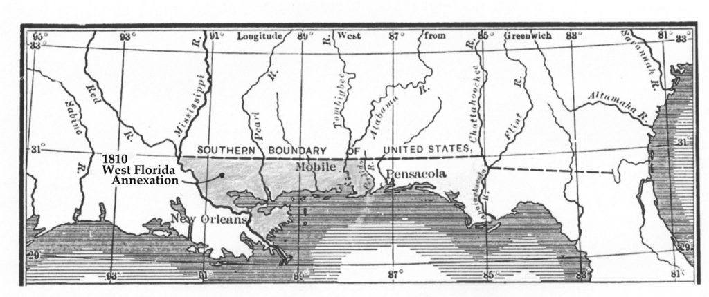 1810. October. In a proclamation by President James Madison, the U.S. arbitrarily annexed Spain’s West Florida from the Mississippi River to the Perdido River, an area that the U.S. believed should have been part of the Louisiana Purchase. The area included the existing towns of Baton Rouge, Biloxi, and Mobile. Spain disagreed that the area was ever part of Louisiana, refused to recognize the annexation, and continued their claim to West Florida in dispute with the U.S. for another ten years.
