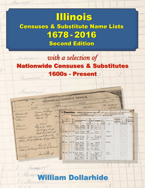 Illinois Censuses & Substitute Name Lists, 1678 – 2016 with a selection of National Name Lists, 1600s – Present, an annotated bibliography of published and online name lists – Second Edition; with FR0236-2 FREE as a PDF download eBook; by William Dollarhide; 107 pp., paper; 8.5×11; Published: 2018; ISBN: 9781628591941; Item # FR0235-2
