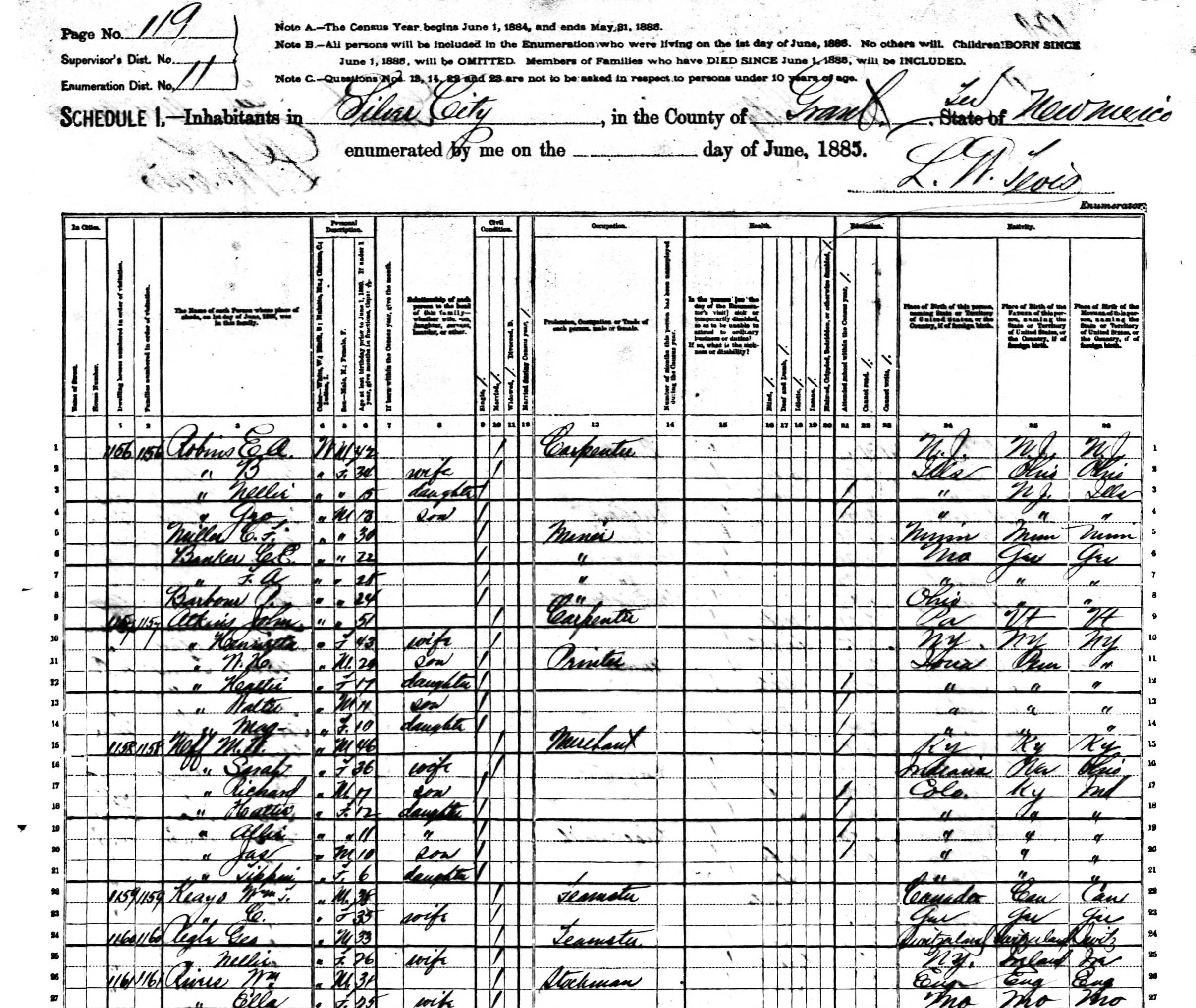 1885 New Mexico Territorial Census (Territory’s Copy) – FamilySearch.org [Microfilm & Digital Capture], this set is located at the University of New Mexico, Albuquerque, NM. To access the digital images, see the FHL catalog page: www.familysearch.org/search/catalog/179492.
