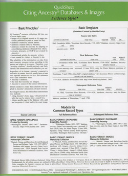 QuickSheet: Citing Ancestry.com Databases & Images. 2nd Edition Rev., Revised by Elizabeth Shown Mills; 4 pp; 2019, Laminated folded sheet; ISBN: 780-008063-2096-0; 8½ x 11, Item # GPC3879