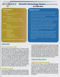 In this fully-updated handy four-page guide, author Angie Bush gives you the simple facts about (a) DNA testing, (b) DNA testing companies, and (c) DNA testing results. She provides a simple overview of the three types of DNA tests: Y-DNA, mtDNA, and Autosomal DNA, the most popular type of testing for genealogists. She goes on to explain which test is right for you and then launches into a description of the testing companies and what you can expect from them. The companies featured in this At a Glance guide were chosen because they are the only companies that provide a list of “genetic cousin” matches based on DNA analysis.