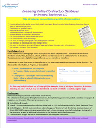 - Evaluating Online City Directory Databases – Ancestral Guide – PDF Ebook; by Regina Negrycz; 2019 4 pp; 8.5×11; 4pp; PDF eBook; ISBN: 978-1-62859-274-0; Item #: FR0804-PDF