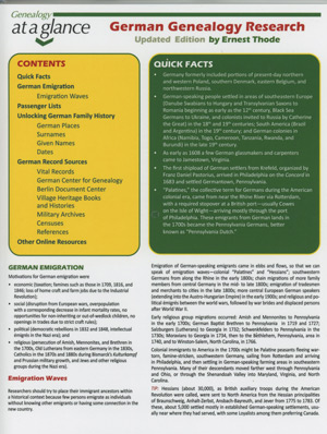 Genealogy at a Glance: German Genealogy Research – Updated Edition; by Ernest Thode; 4 pp., folded; Laminated; 8.5×11, Published: 2020; ISBN: 9780806321035; Item # GPC5761