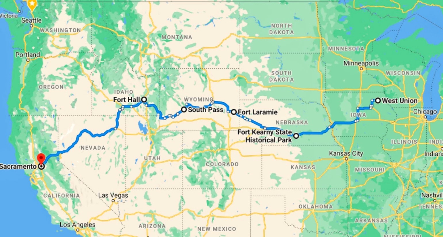 Go to Google Maps – Directions. The travel directions map can be initiated from the basic Google search screen, e.g., by typing two points desired, such as “West Union IA to Sacramento CA.” This will bring up an inset map at the Google results list that can be clicked on to enlarge the map image into the regular Google Maps screen. Google Maps predicts the fastest route, but not necessarily the shortest route between two points on a map. Any historic route needs to be introduced to Google, so at this point, the map can be zoomed in or out to modify the first default route chosen by dragging the blue line highlighting the selected route. Adding in-between destinations/stops helps refine the route, e.g., adding Fort Kearney NE; then Fort Laramie, South Pass, and Fort Hall WY adjusted the map route to match more closely to the trace of the 1860 Oregon-California Trail. (This method was used to produce the map below). To start with Google Maps, see https://maps.google.com.