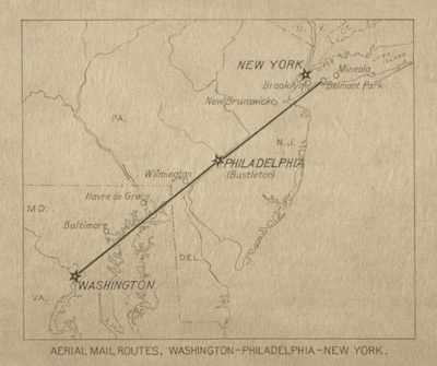 The first regularly scheduled airmail route connected New York and Washington, D.C., via Philadelphia, from May 15, 1918, to May 31, 1921. The Post Office Department operated the 218-mile route to demonstrate that mail transportation by airplane was possible on a regular schedule in all kinds of weather.